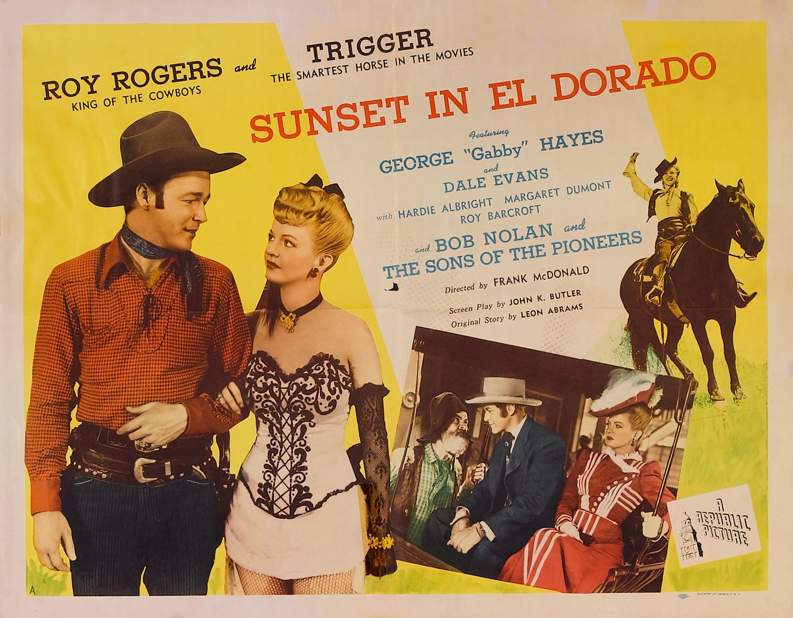 • Sunset In El Dorado” (Republic, 1945) Starring Roy Rogers, George “Gabby” Hayes, Dale Evans, Hardie Albright and Margaret Dumont. Directed by Frank McDonald.